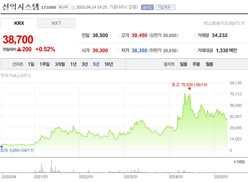 선익시스템의 최근 5년 주가 흐름을 살펴보면 2020년 저점인 5,650원에서 출발해, OLED 장비 수요 확대와 기술력에 대한 기대감으로 상승세를 이어갔습니다. 2024년 6월에는 최고가인 75,500원을 기록하며 정점을 찍었습니다. OLED 관련 투자 확대와 함께 삼성 및 애플향 공급 기대감이 반영된 것으로 생각됩니다.