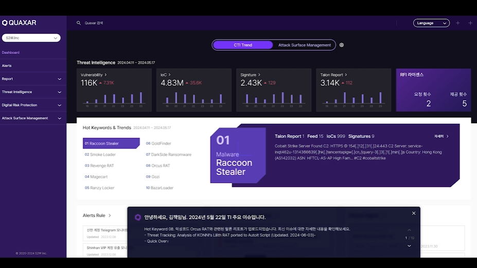 에스투더블유의 핵심 기술은 정형 및 비정형 데이터를 실시간으로 수집·정제하고, 온톨로지 기반 지식 그래프를 활용해 데이터 간의 관계를 분석하는 것입니다. 이를 통해 기존에 드러나지 않던 정보를 시각화하거나 고객이 필요로 하는 핵심 정보만 추출하여 제공하고 있습니다.